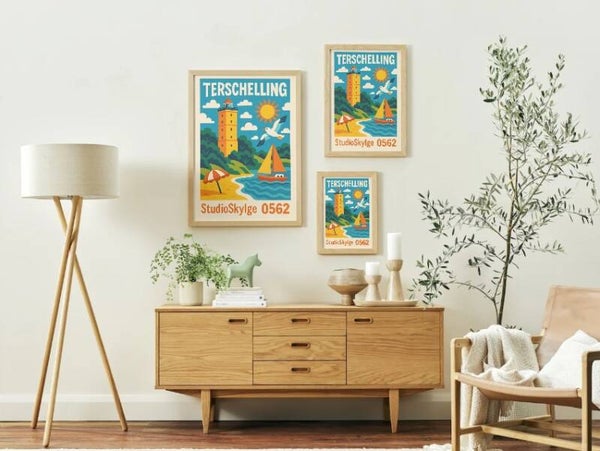 Op zoek naar een stukje Terschelling voor aan de muur? Deze poster is met liefde voor het eiland ontworpen en klaar om meteen te downloaden. Print 'm zelf thuis of laat 'm professioneel afdrukken in het formaat dat jij mooi vindt. Perfect om je ruimte wat extra stijl te geven of om cadeau te doen!